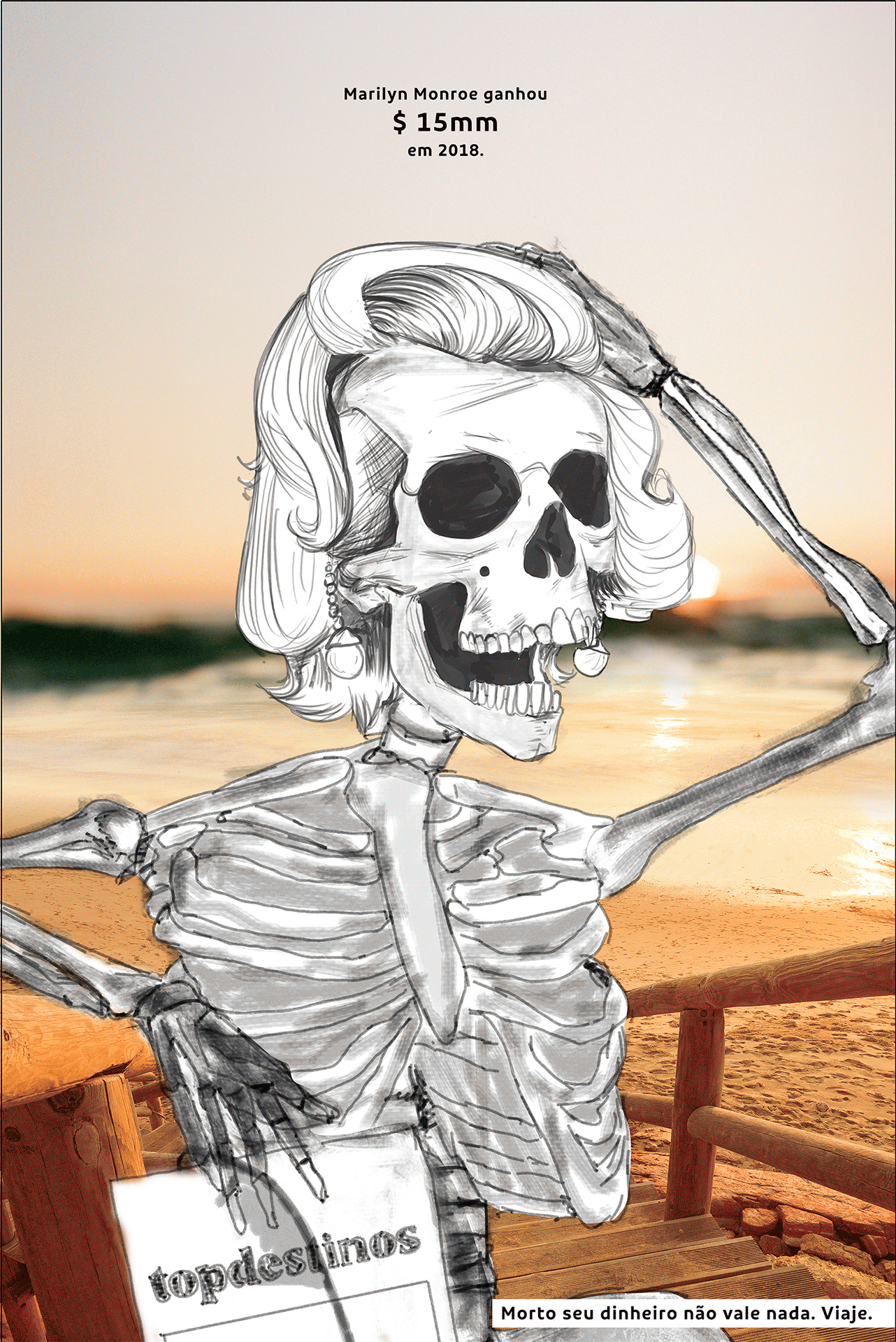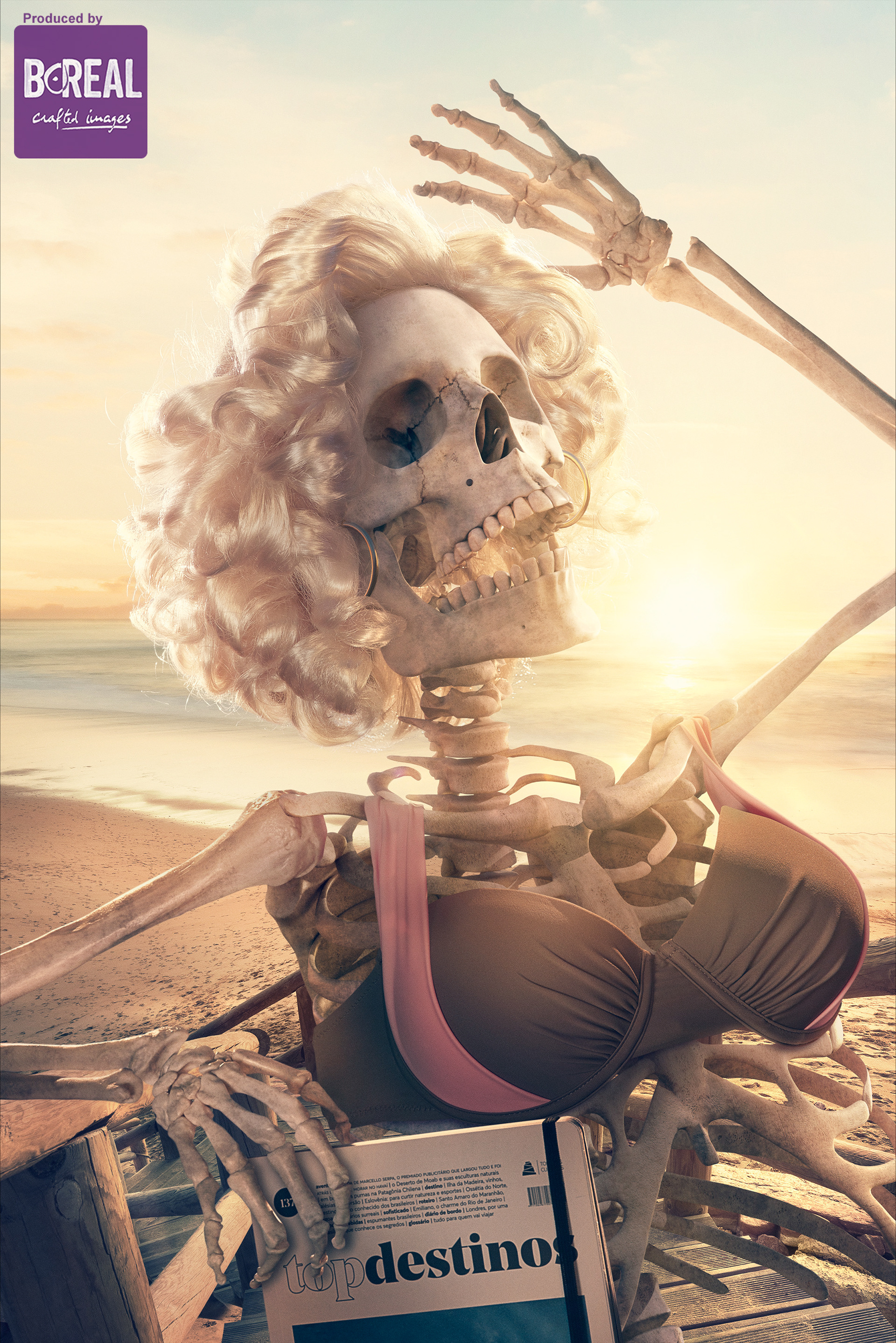 Mescla de produção fotográfica e 3D para os esqueletos. Os fundos foram disponibilizadas pela agência e retocado por nós. Os acessórios, cabelos, roupas dos personagens e revistas também foram feitos através de produção fotográfica. ➡️ Veja acima o processo de construção da imagem da Marilyn Monroe.